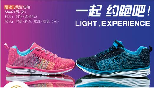 另一款,杏耀平台2017全新超轻飞线运动鞋,同样采用织物鞋面+成型EVA鞋底。