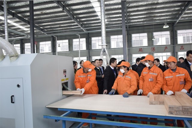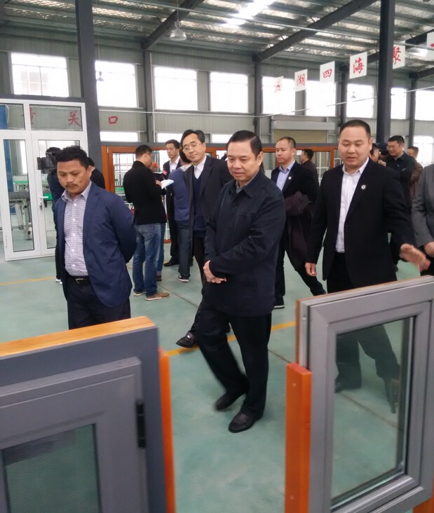 河南省委常委、常务副省长李克、副省长王艳玲在信阳星欧窗业公司参观木包铝样品