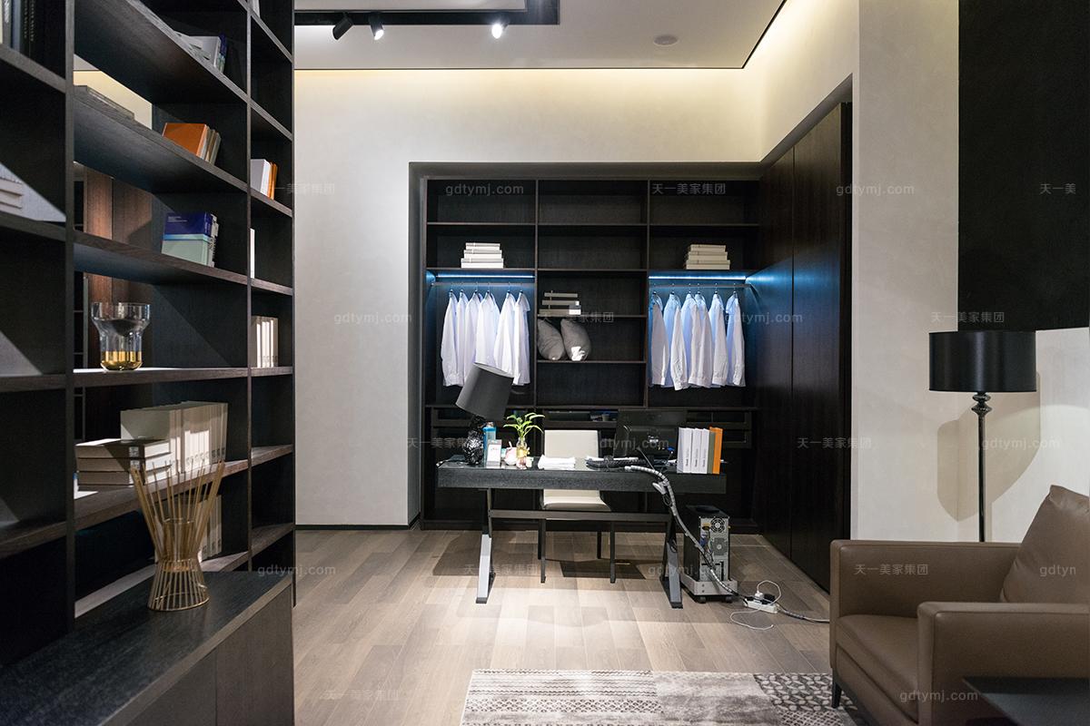 主卧空间的简奢风格大床,没有中式的沉重、欧式的繁复,巧妙地利用软包元素,打造出了不同凡响的奢华感受。那床品的一抹纯色,仿佛为空间注入了鲜活的动力,让空间从内部散发出直抵内心的震撼力量。而整面的仿古墙面,成暗灰色系分布于墙面,让浓浓的文化底蕴恰如其分的表现出来,也和另一面黑色的墙壁相互辉映,搭配得刚刚好,使得整体星欧设计的气质完美搭配。
