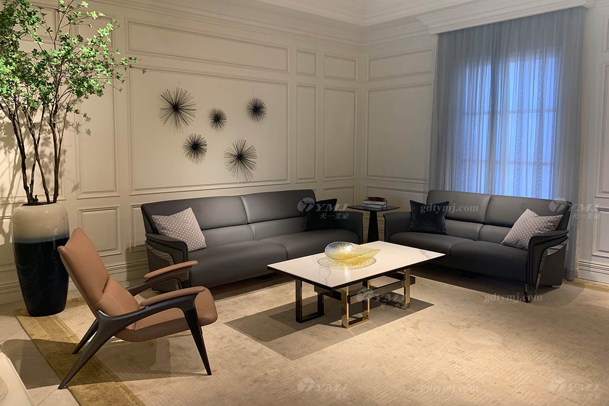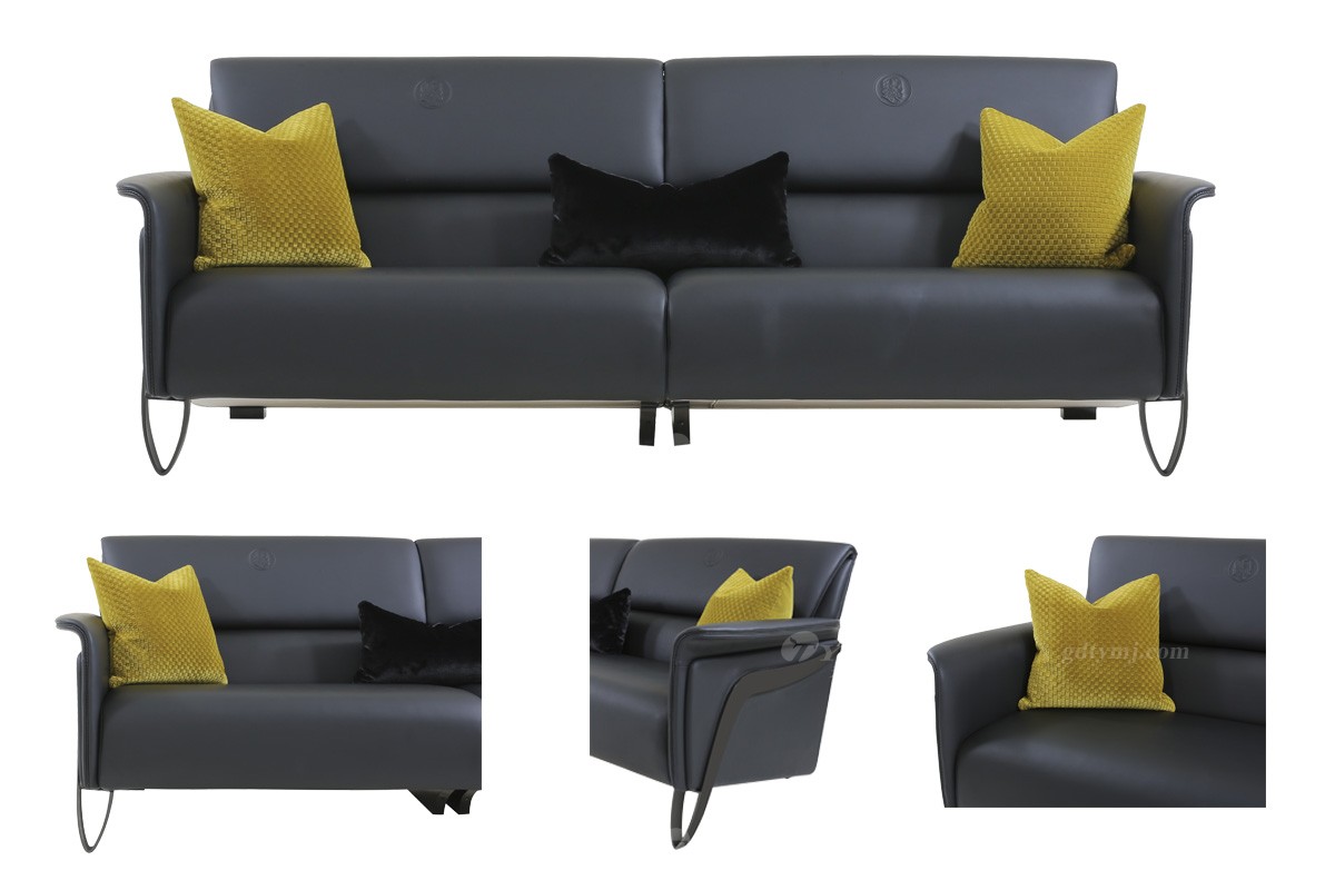 沙发前腿打破常规,采用芭蕾舞者形体元素,犹如踮 起脚尖,轻盈而又优雅。整体采用黑白灰三色的无彩色系运用,高级而具酷感,面料采用了NAPPA皮、无极绒平纹编织、条纹交织棉麻混纺三种材质的组合,增加产品的丰富性及艺术 感,呈现出简约而不简单的设计效果。从腿部贯穿扶手的“回旋镖”型的黑钛色金属运用, 简约时尚、个性鲜明,富有生活情趣。