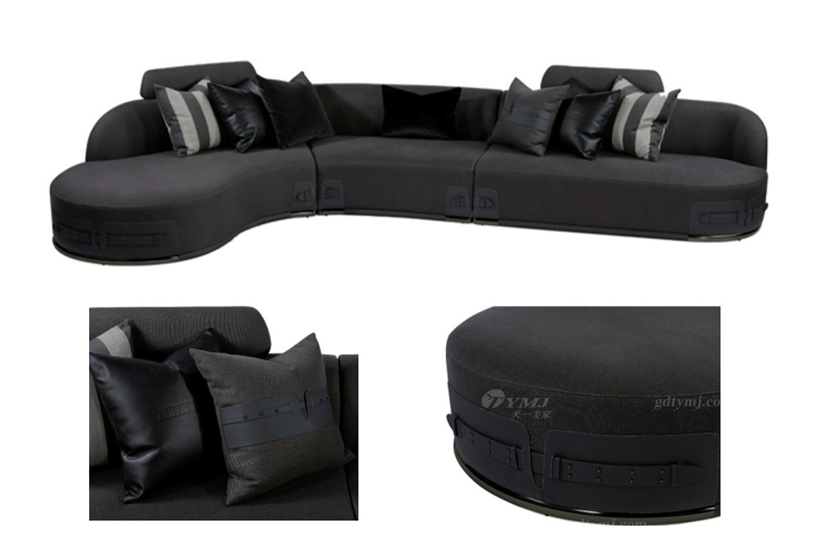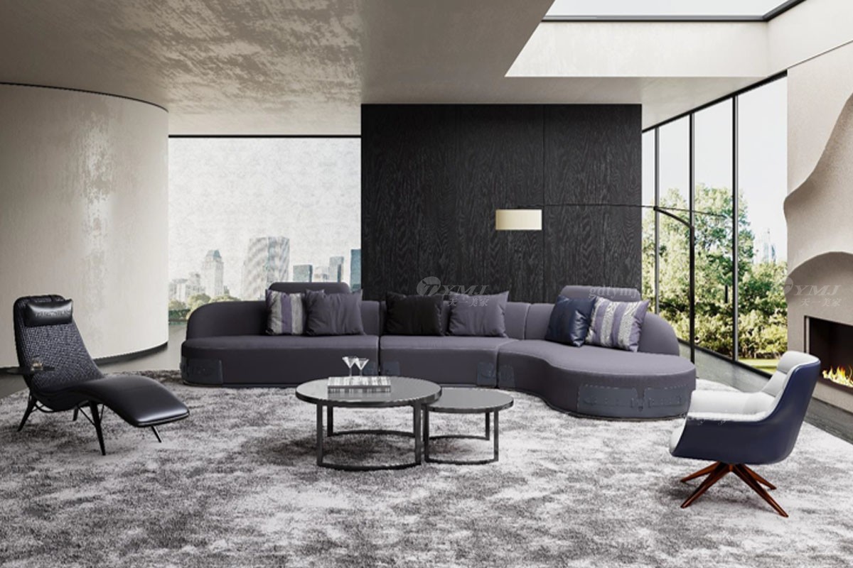 沙发整体采用了塞纳河畔的蜿蜒线条,以优雅 的弧形展示左岸的文化及魅力。采用时尚箱包的元素、多种面料的组合、金属 的运用等等,如同左岸的文化包容性,将众多 具有时尚的元素、艺术的特点融合在一起,打 造一个完整的艺术品。座面选用了Armani服装工艺面料编织纹棉麻 混纺,高麻含量,具有耐磨、透气、抗菌、抗 皱、不起球,不变形的效果,即使是夏天皮肤 直接接触也不会不舒服,婴儿裸坐也没问题。提取Burberry箱包皮袢造型,将现代肌理面料与硬皮的箱包工艺巧妙结合,使沙发时尚精致。在沙发最佳洽谈角度,设置两个靠头,使沙发兼具高背与矮背,适合更多人群。整体以灰色为主调性,低调而又有高级感,运用不同的灰色层级关系与多种材质的组合来体 现沙发的层次。